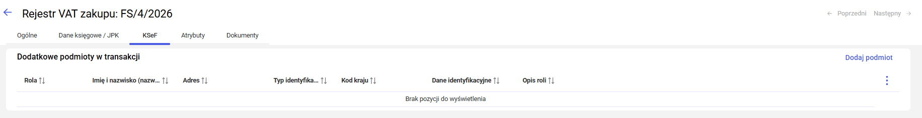 Możliwość dodania dodatkowego podmiotu (roli) znajduje się na formularzu dokumentu w rejestrze VAT (sprzedaży lub zakupu), w zakładce [KSeF], w dedykowanej sekcji Dodatkowe podmioty w transakcji.