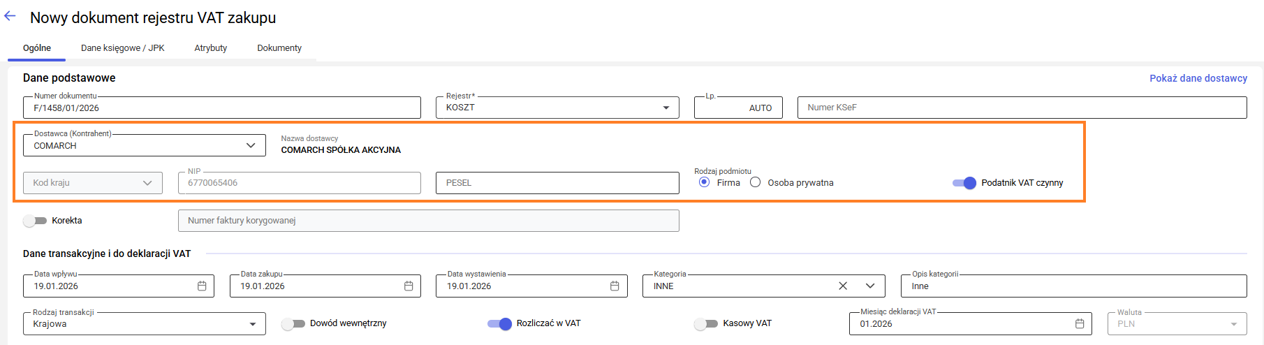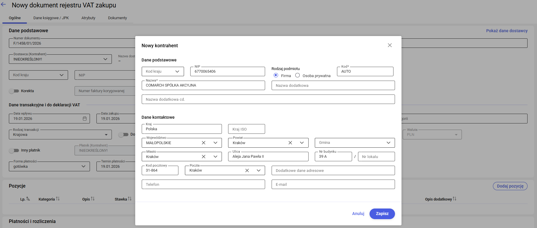 W efekcie karta kontrahenta zostaje zapisana i zamknięta, a na formularzu dokumentu wyświetlają się dane nowo dodanego kontrahenta: nazwa, kod kraju, numer NIP/PESEL oraz informacje o rodzaju podmiotu i statusie VAT.