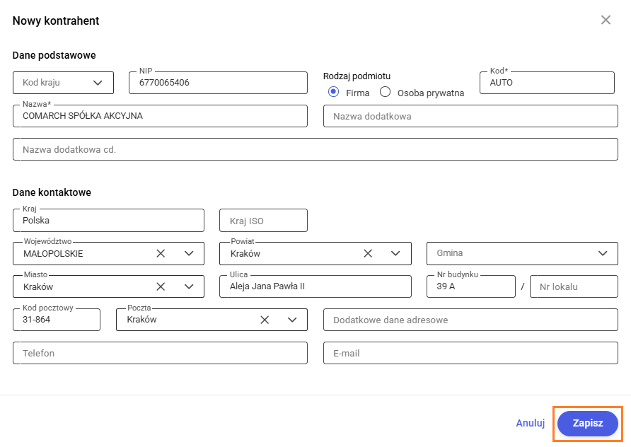4. Ostatni krok to kliknięcie przycisku Zapisz, aby założyć kartę kontrahenta.