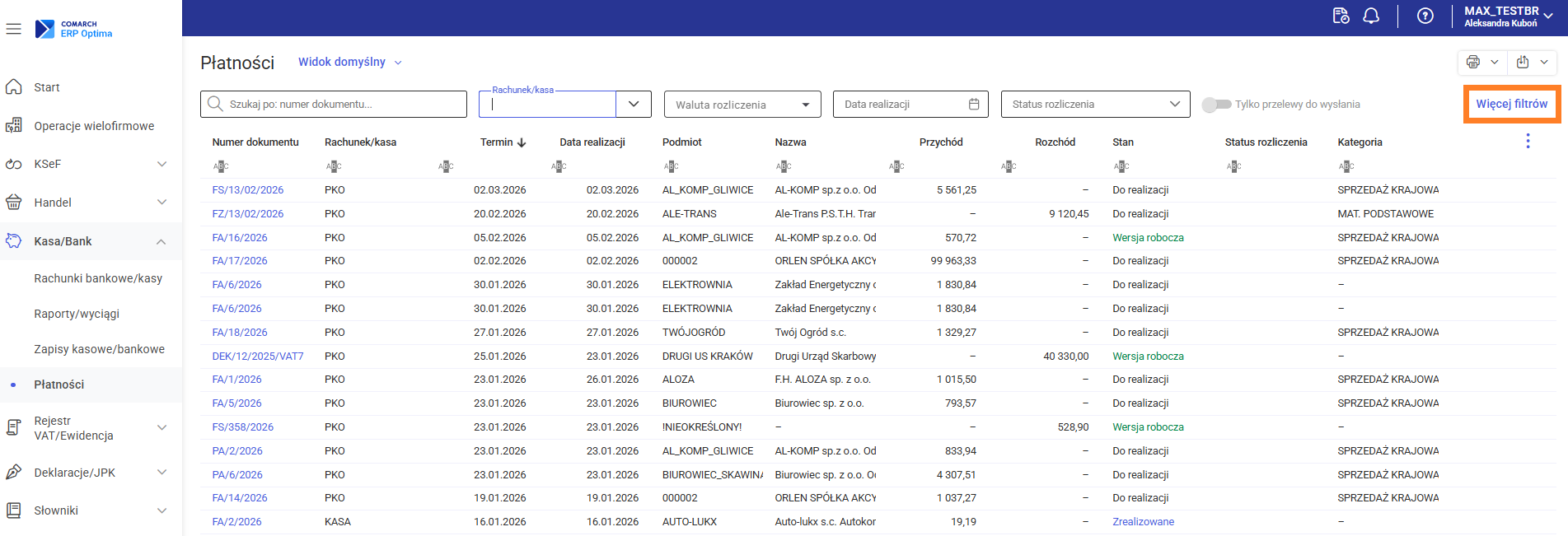 Użytkownik ma możliwość zarządzania filtrami na liście płatności poprzez wybranie opcji Więcej filtrów znajdującej się w prawym górnym rogu okna. Po wybraniu tej opcji pojawi się boczne menu z dodatkowymi filtrami.