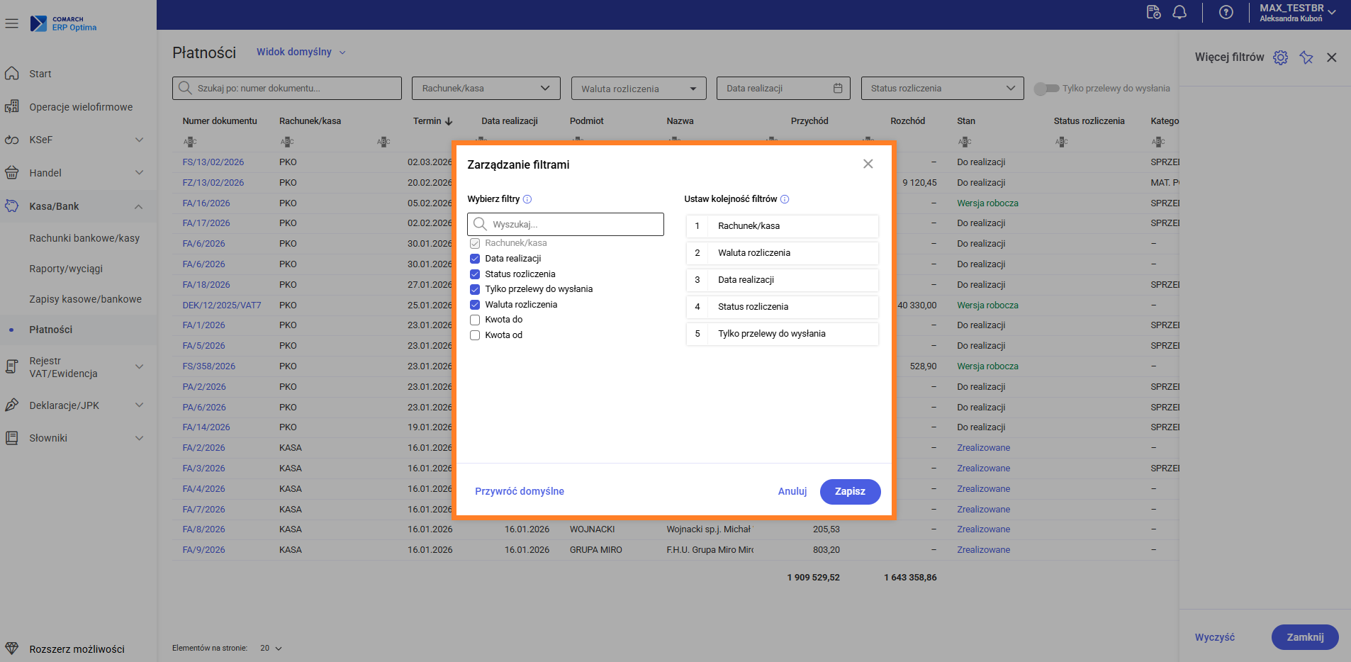 - Rachunek/kasa– pozwala filtrować płatności według rachunku/kasy, którego dotyczą