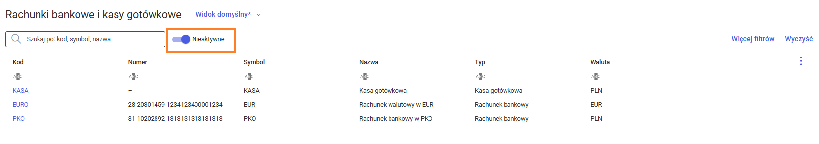 Domyślnie filtr ten jest wyłączony, co oznacza, że na liście widoczne są tylko rachunki aktywne.