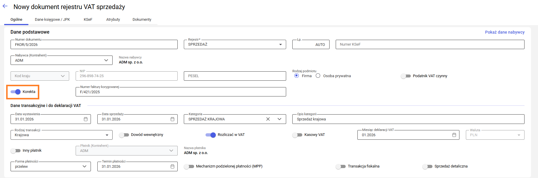 3. Po otwarciu formularza dokumentu, w zakładce [Ogólne] należy aktywować parametr Korekta za pomocą dedykowanego przełącznika.