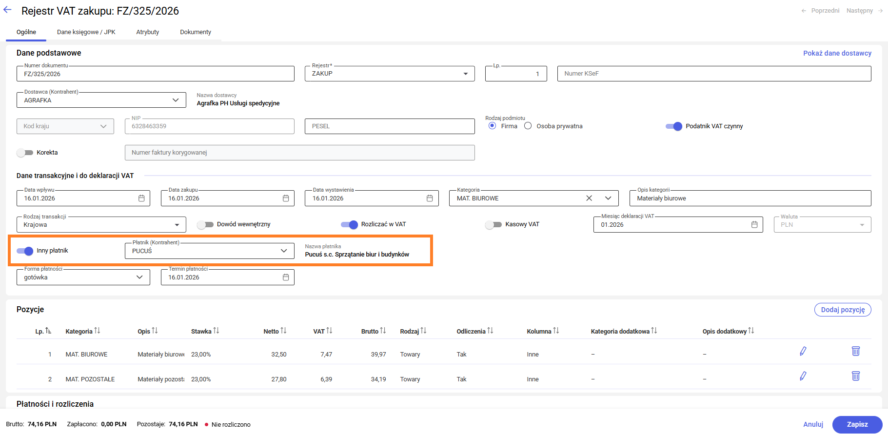Jak wskazać innego płatnika na dokumencie w rejestrze VAT?