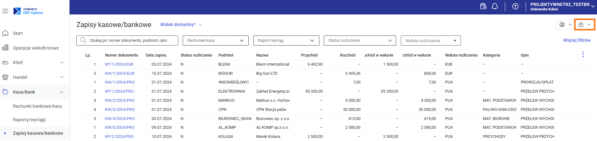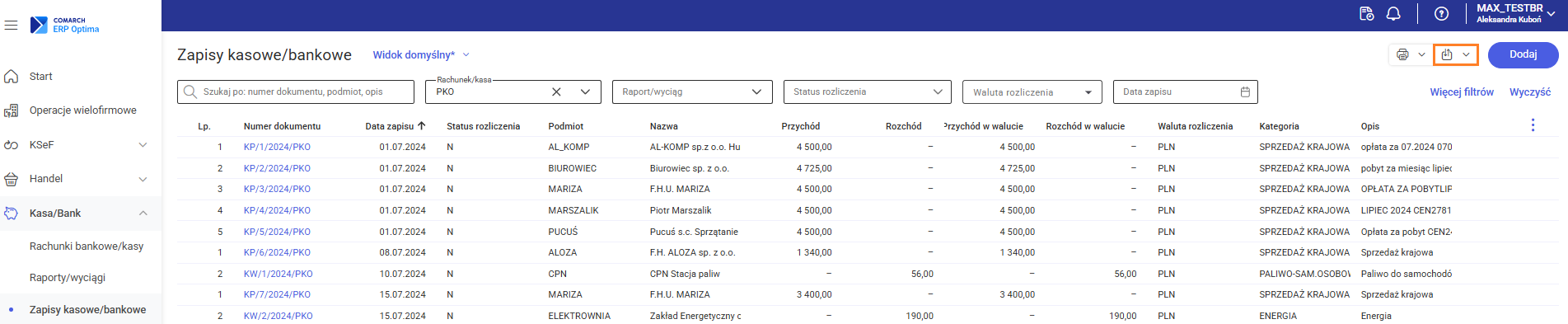 Aby wyeksportować listę zapisów kasowych/bankowych, należy z poziomu Kasa/Bank > Zapisy kasowe/bankowe w prawym górnym rogu kliknąć ikonę Eksportuj.
