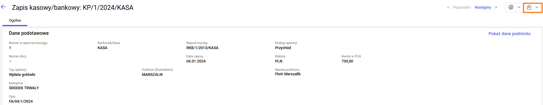Dodatkowo, z poziomu otwartego formularza zapisu kasowego/bankowego również dostępna jest opcja eksportu listy zapisów kasowych/bankowych.