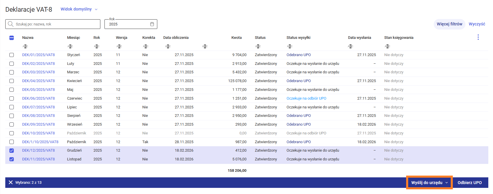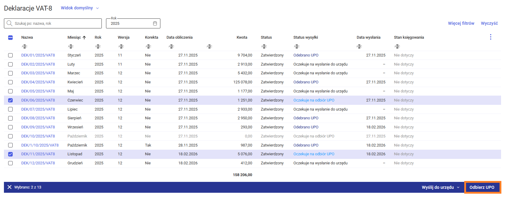 Aby seryjnie odebrać UPO, należy zaznaczyć na liście wybrane deklaracje VAT-8, a następnie w pasku akcji wyświetlonym na dole okna wybrać opcję Odbierz UPO.