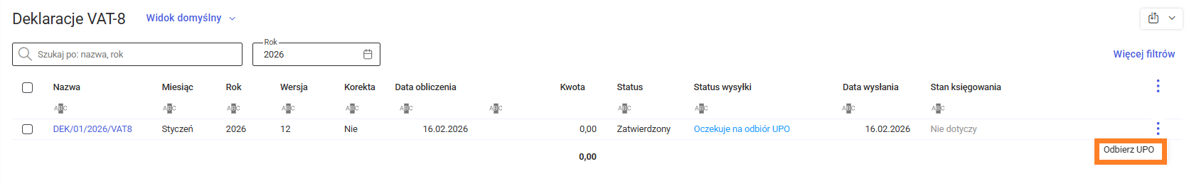 Aby odebrać UPO, należy kliknąć w ikonę trzech kropek znajdującą się końcu wiersza, a następnie wybrać opcję Odbierz UPO.