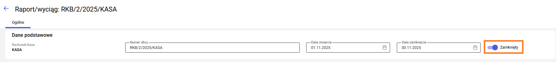 Aby zamknąć wybrany raport/wyciąg, należy w menu bocznym przejść do Kasa/Bank > Raporty/wyciągi, otworzyć formularz danego raportu i zaznaczyć parametr Zamknięty.
