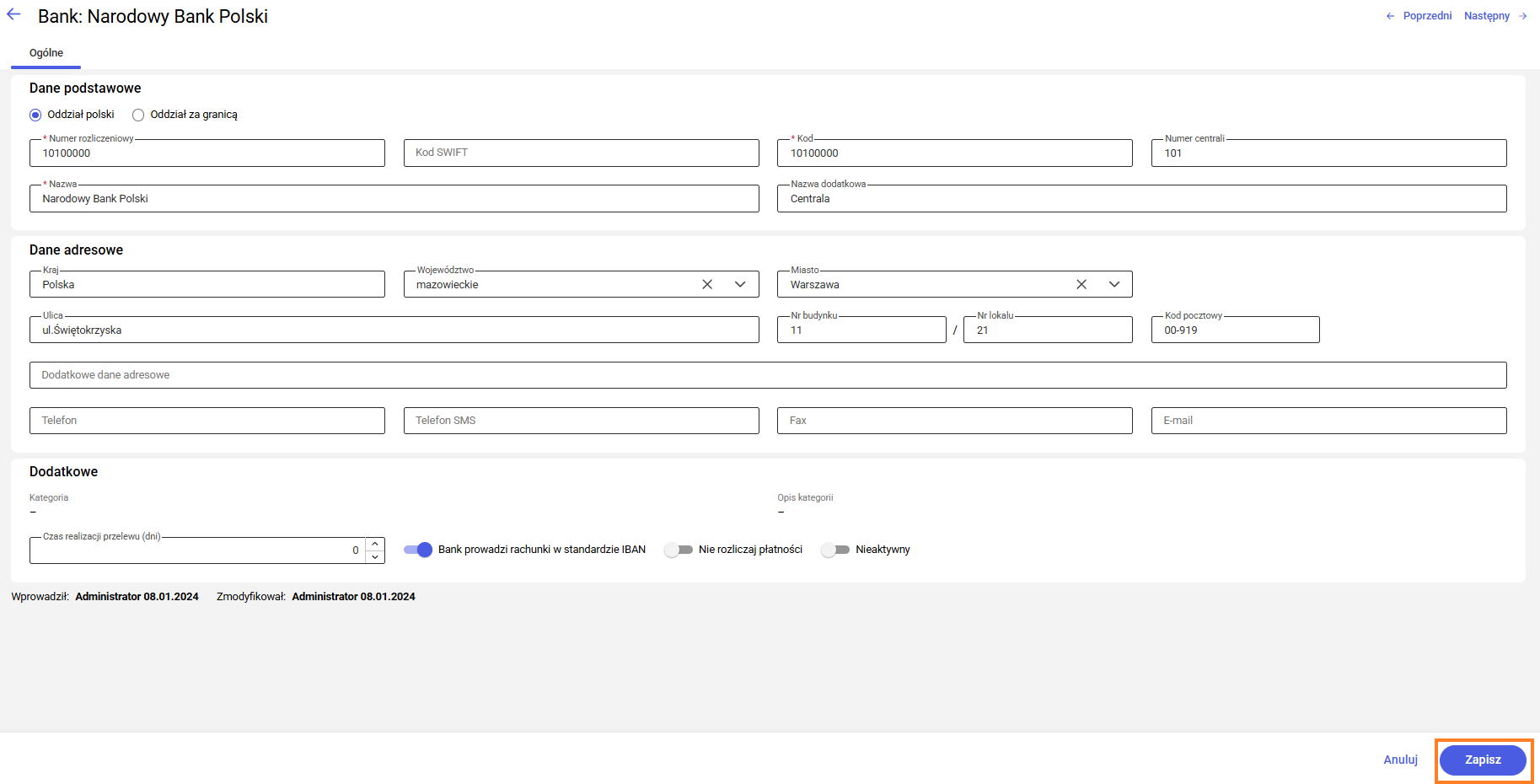 W celu aktualizacji informacji w formularzu banku należy w menu bocznym przejść do zakładki Słowniki > Inne > Banki. Następnie należy kliknąć w kod wybranego banku aby otworzyć jego formularz. Po otwarciu okna możliwa jest edycja poszczególnych pól.