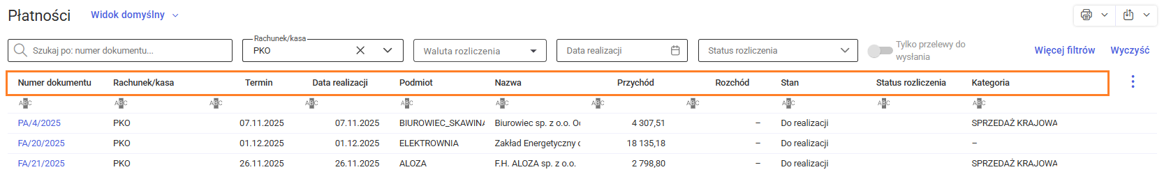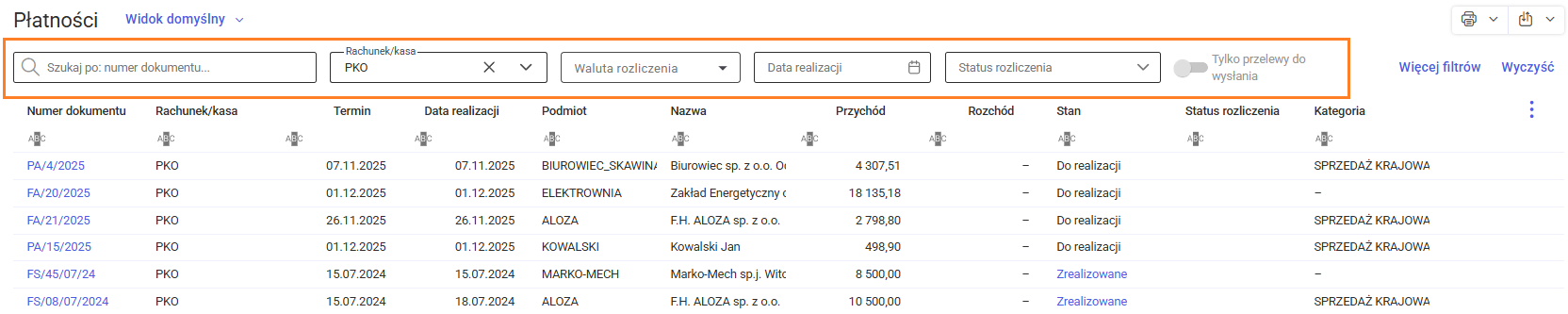 Obok pola wyszukiwania znajduje się filtr Rachunek/kasa, który pozwala wyświetlić płatności tylko z wybranego rachunku lub kasy. Dodatkowo, można zawęzić listę płatności, wskazując walutę rozliczenia, datę realizacji lub status rozliczenia.