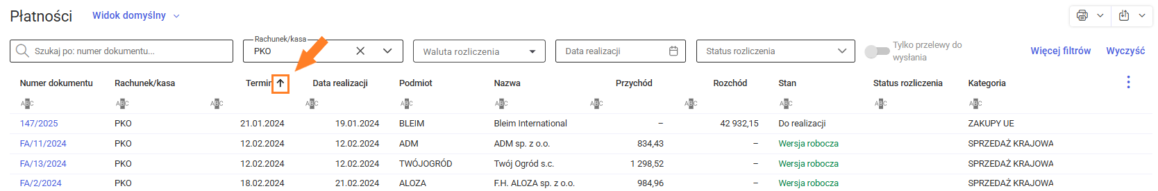 Ponadto, istnieje możliwość sortowania listy płatności według wybranej kolumny, co pozwala na uporządkowanie listy zgodnie z potrzebami użytkownika.