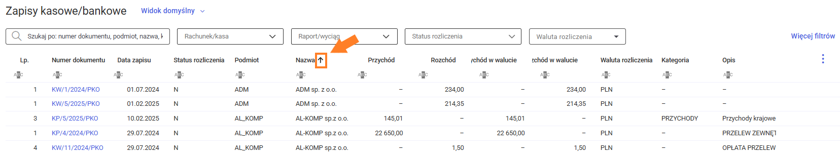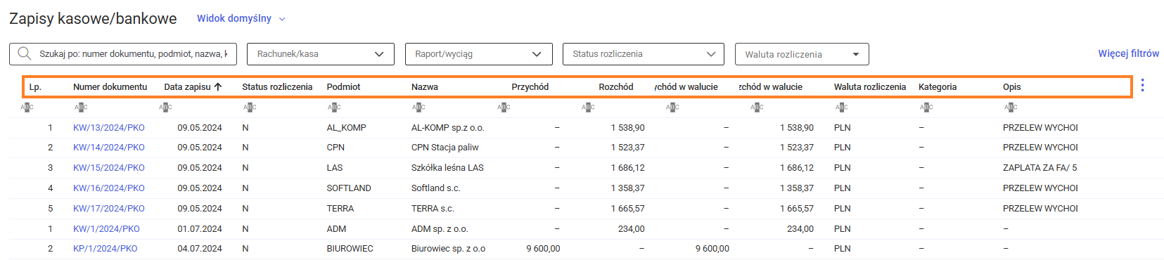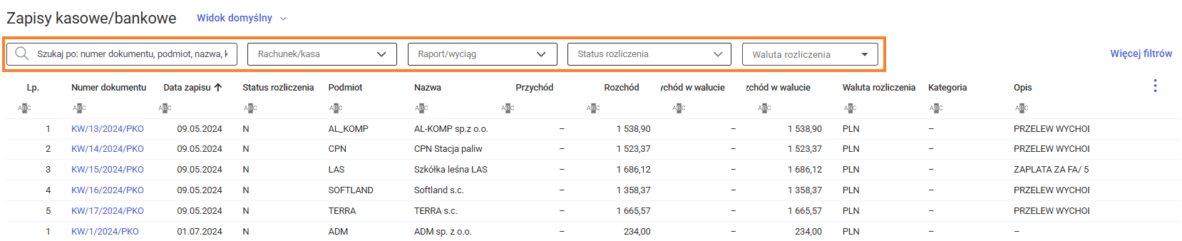 Na górze listy znajduje się pole wyszukiwania, które umożliwia filtrowanie listy zapisów kasowych/bankowych według numeru dokumentu, podmiotu, nazwy, kategorii, opisu, numeru wewnętrznego.