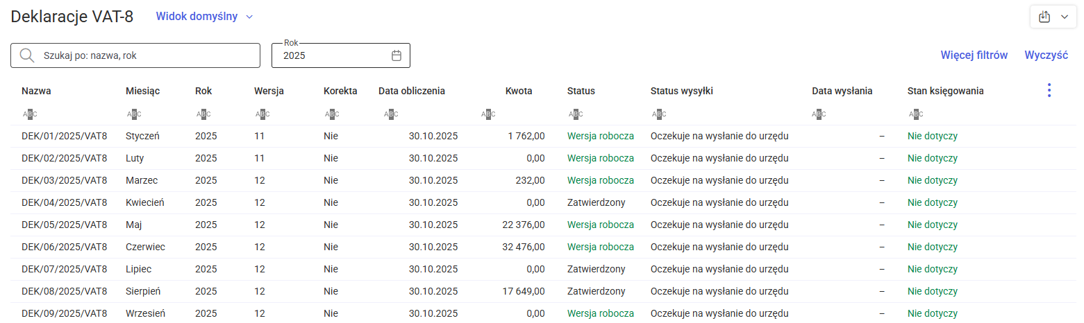 Na górze listy znajduje się pole wyszukiwania, które umożliwia filtrowanie deklaracji według nazwy i roku. Obok pola wyszukiwania znajduje się pole Rok, które pozwala na wyświetlenie deklaracji wyłącznie z wybranego roku. Ponadto, istnieje możliwość sortowania listy deklaracji VAT-8 według wybranej kolumny, co pozwala na uporządkowanie listy zgodnie z potrzebami użytkownika.