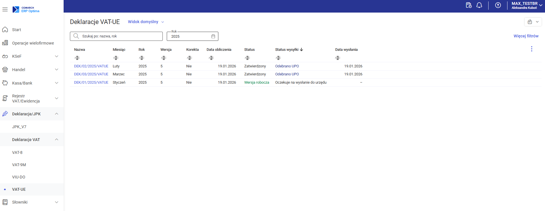 Lista deklaracji VAT-UE zawiera kluczowe informacje o deklaracji, m.in.: