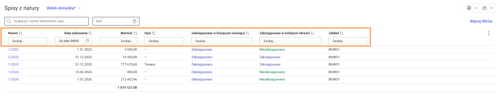Informacje na temat filtrowania na liście spisów z natury  znajdują się w artykule Jak filtrować i wyszukiwać spisy z natury na liście?