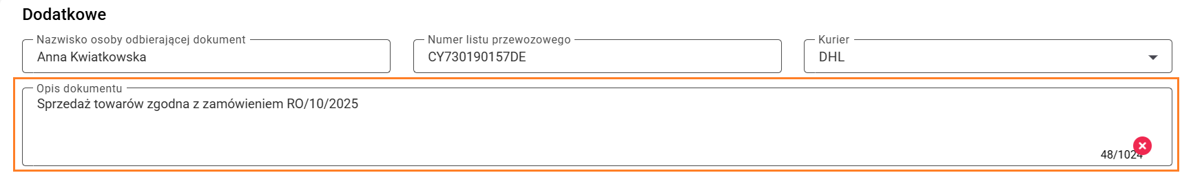 Użytkownik ma możliwość dodania opisu do dokumentu. W dolnej części formularza, w sekcji Dodatkowe znajduje się pole tekstowe Opis dokumentu. W tym miejscu można wpisać dowolne uwagi, instrukcje lub inne dodatkowe informacje dotyczące dokumentu. Pole umożliwia wprowadzenie do 1024 znaków. Wprowadzony opis zostaje zapisany razem z dokumentem i pojawia się na wydruku faktury.