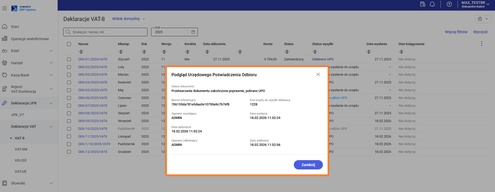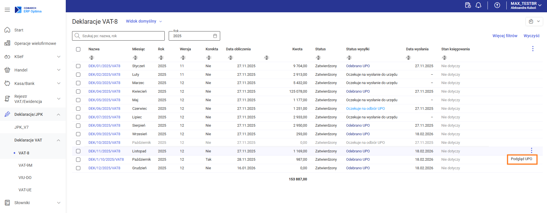 Aby wyświetlić UPO dla wysłanej deklaracji VAT-8, VAT-9M lub VIU-DO , należy postępować zgodnie z poniższymi krokami: