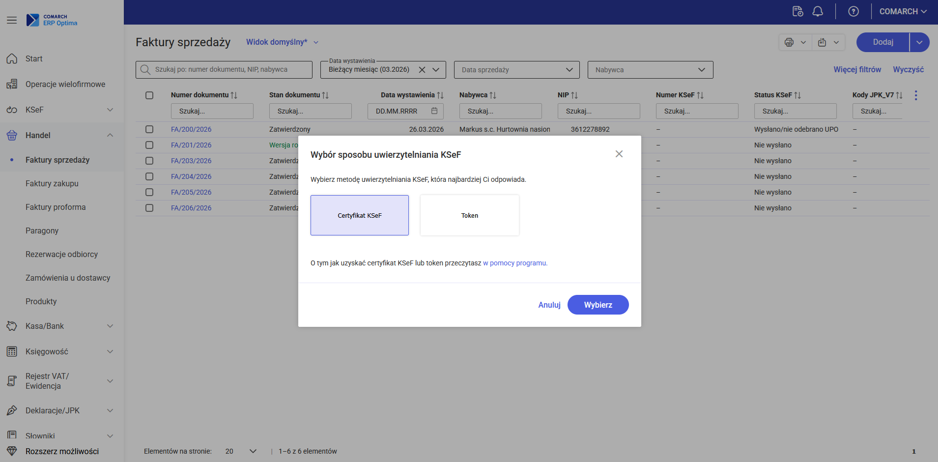 W następnym kroku zostanie otwarte okno Wybór sposobu uwierzytelniania KSeF, na którym użytkownik musi wskazać jedną z dwóch metod: