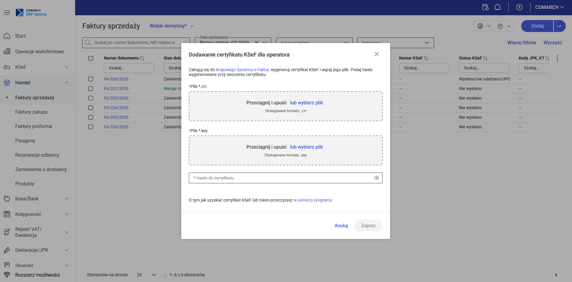 Hasło do certyfikatu jest szyfrowane i przechowywane w wydzielonej, chronionej pamięci, co zapewnia najwyższy poziom bezpieczeństwa danych i eliminuje konieczność jego wprowadzania przy każdej wymianie danych z KSeF.