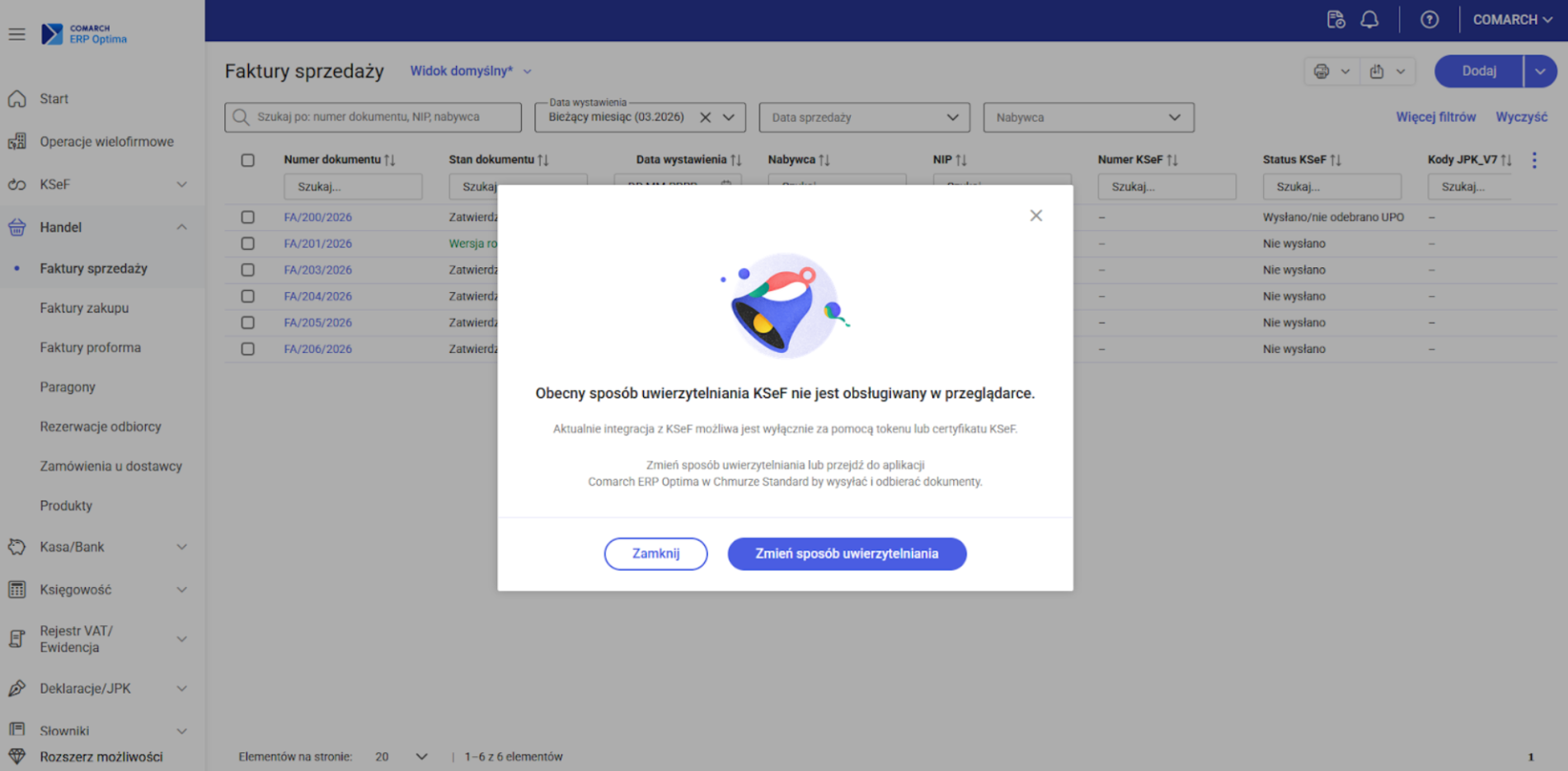 Brak wcześniejszej konfiguracji sposobu uwierzytelniania lub wybór metody innej niż certyfikat KSeF lub token w wersji chmurowej (formy wspierane przez wersję przeglądarkową) spowoduje zablokowanie wysyłki do KSeF oraz wyświetlenie stosownego komunikatu.