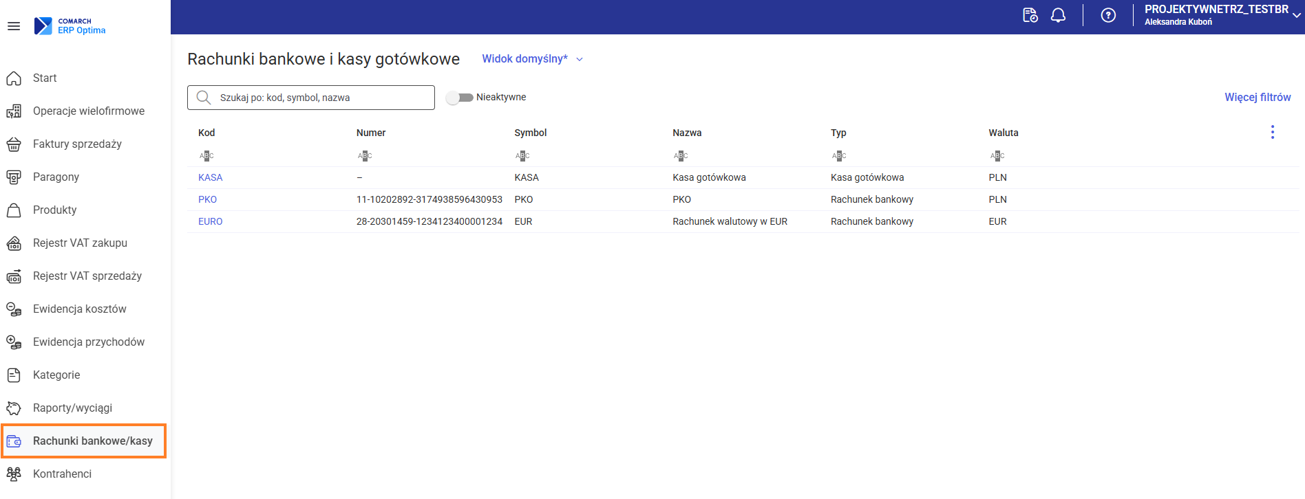 Po wybraniu tej opcji zostanie wyświetlona pełna lista dostępnych rachunków bankowych oraz kas gotówkowych.