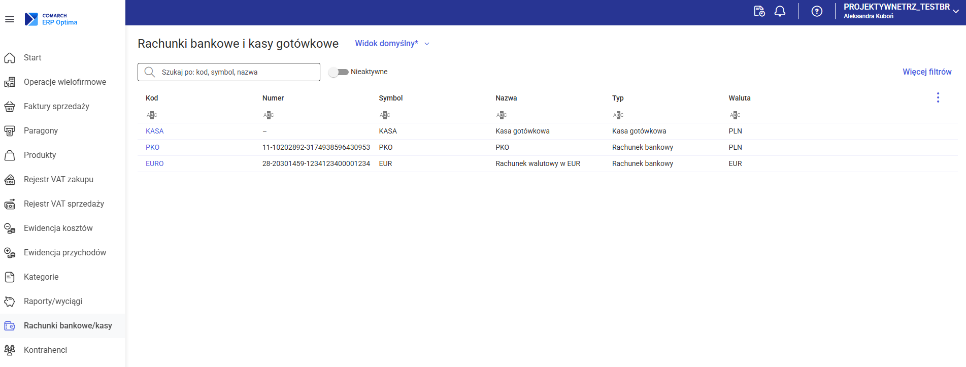 Obok pola wyszukiwania znajduje się przełącznik Nieaktywne, który pozwala na wyświetlanie lub ukrycie rachunków bankowych/ kas gotówkowych oznaczonych jako nieaktywne.