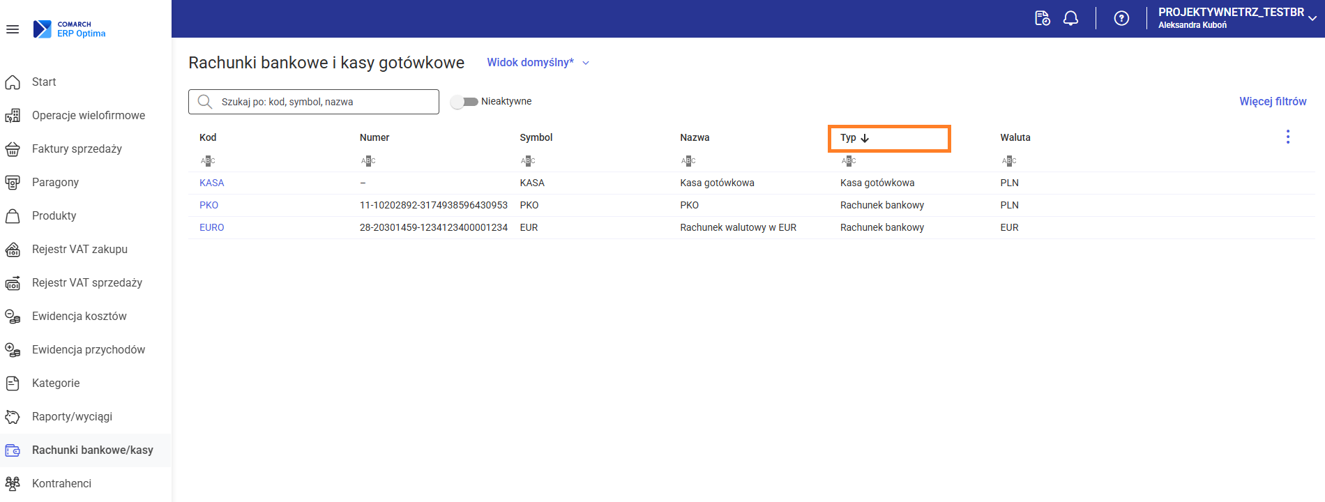 Ponadto, istnieje możliwość sortowania listy rachunków bankowych/ kas gotówkowych według wybranej kolumny, co pozwala na uporządkowanie listy zgodnie z potrzebami użytkownika.