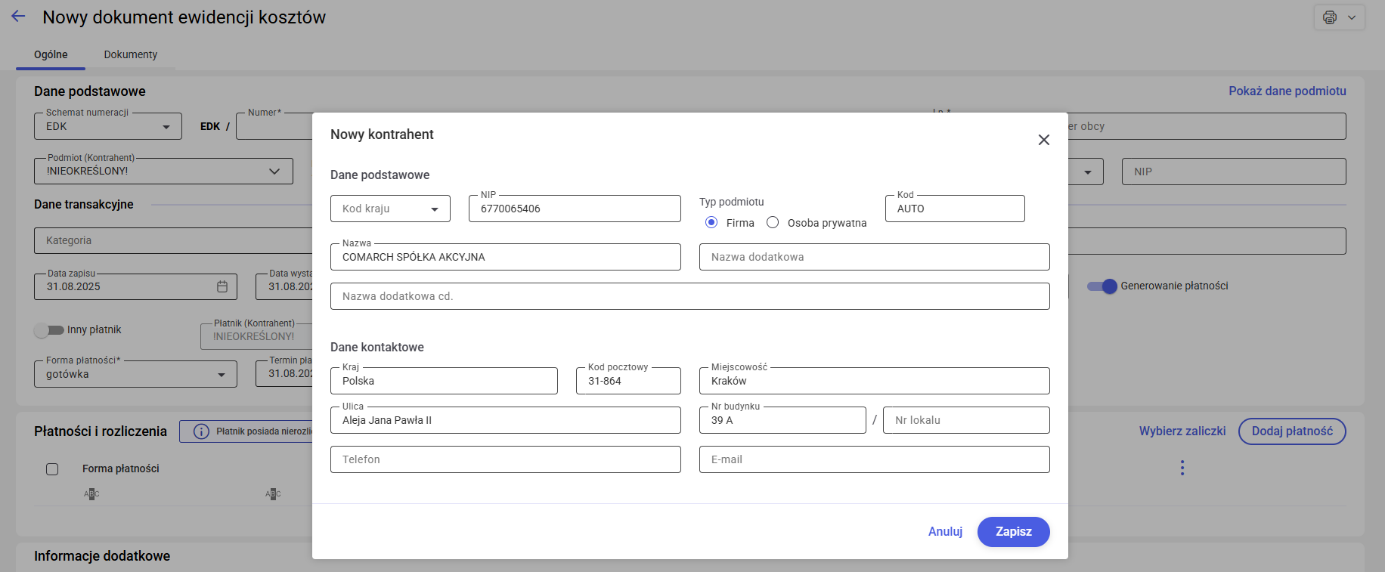 Podczas dodawania nowego kontrahenta na formularzu dokumentu w ewidencji kosztów/przychodów istnieje możliwość modyfikacji danych pobranych automatycznie z bazy GUS/VIES.