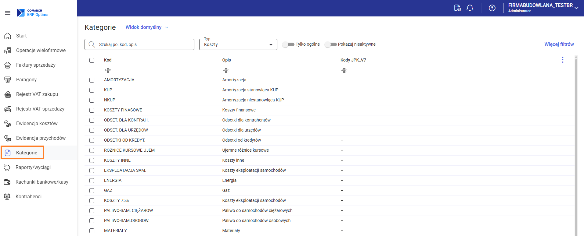 Aby odnaleźć dodane w firmie kategorie należy w menu bocznym wybrać opcje Kategorie:
