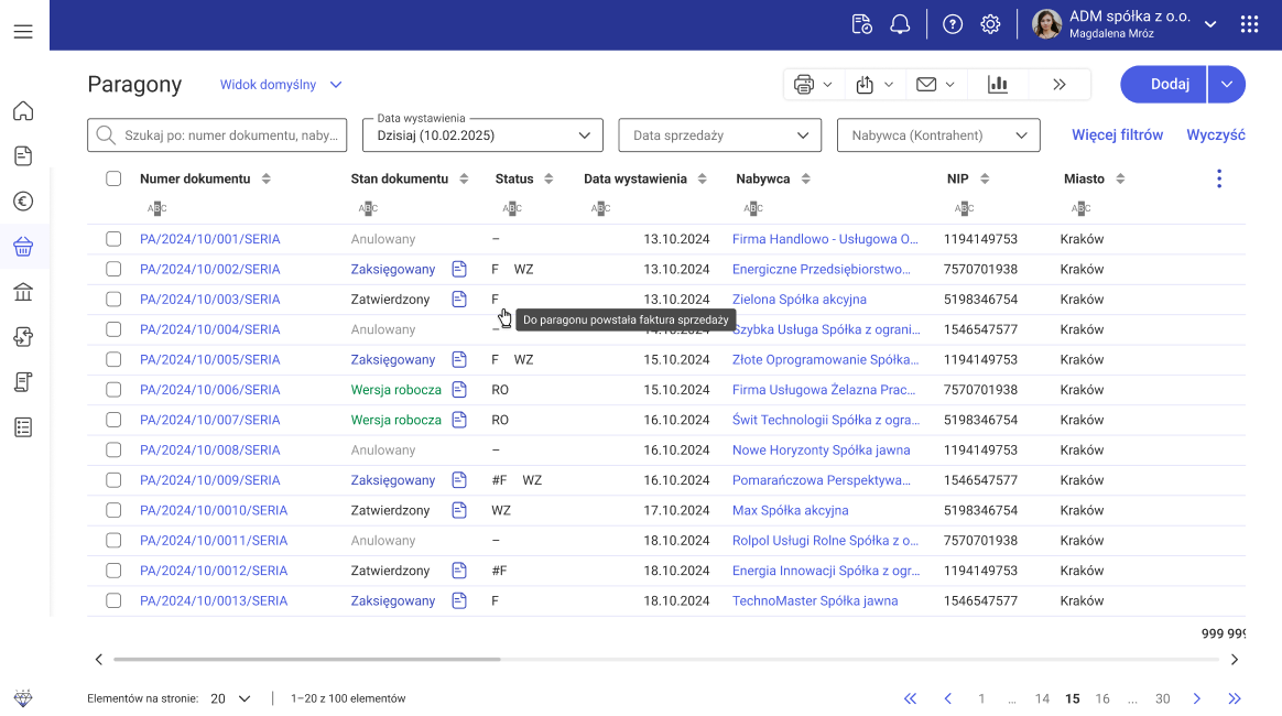 Wystarczy, że użytkownik najedzie kursorem na pole statusu, aby zobaczyć szczegółowy opis w formie podpowiedzi np. Utworzono fakturę, Paragon z wydaniem zewnętrznym. Dzięki temu może natychmiast zorientować się, na jakim etapie znajduje się dokument oraz jakie operacje zostały na nim wykonane lub z jakimi innymi dokumentami jest powiązany.