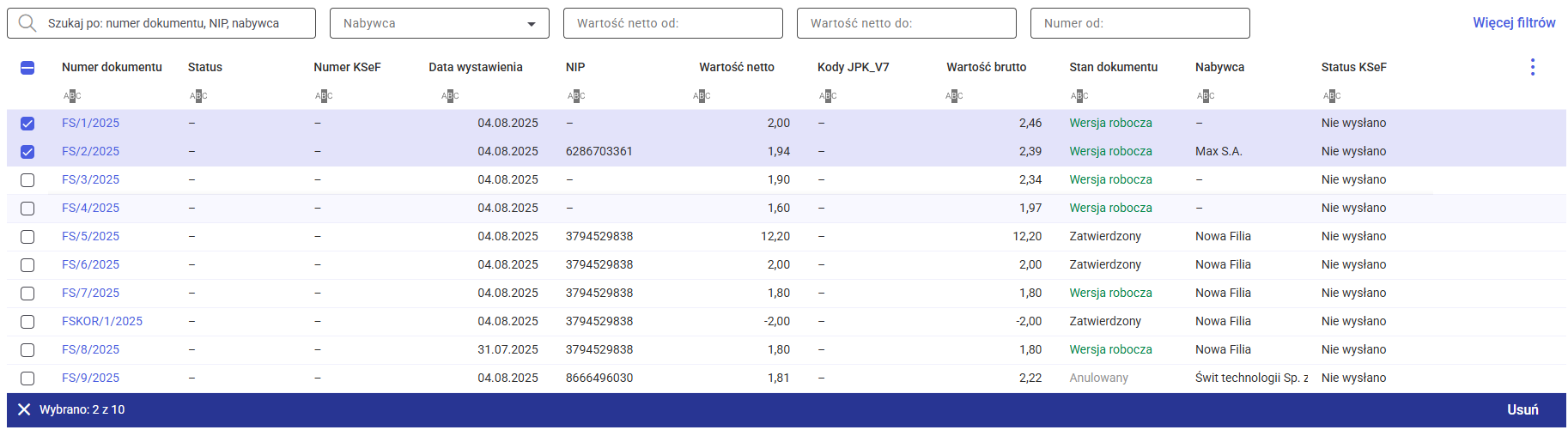 Dokumenty można usuwać pojedynczo lub seryjnie (zbiorczo):