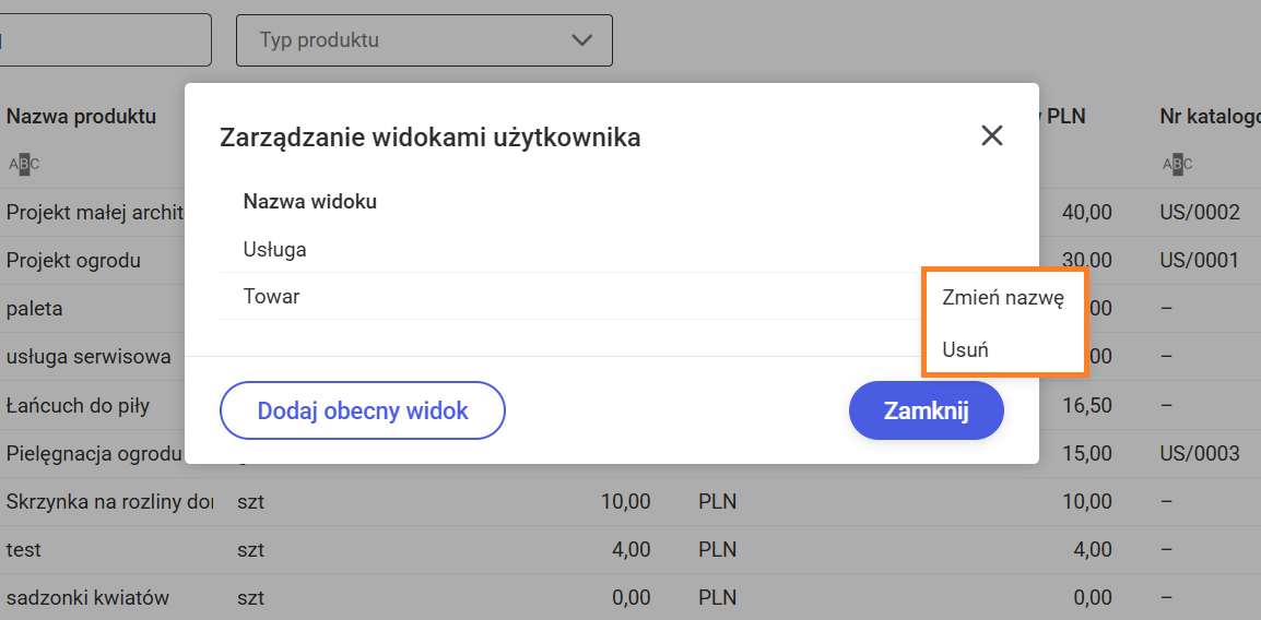 Utworzony przez użytkownika widok można usunąć, zmienić mu nazwę lub zaktualizować go. Aby usunąć dodany widok lub zmienić mu nazwę, należy na liście widoków wybrać opcję Zarządzaj, a następnie na oknie Zarządzanie widokami użytkownika poprzez rozwinięcie listy rozwijanej za pomocą ikony trzech kropek wybrać opcję Usuń lub Zmień nazwę.