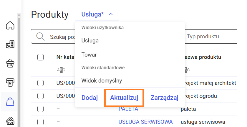 , sygnalizujący wprowadzenie zmian w tym widoku. Aby dokonać aktualizacji danego widoku należy rozwinąć listę widoków i kliknąć w przycisk Aktualizuj.