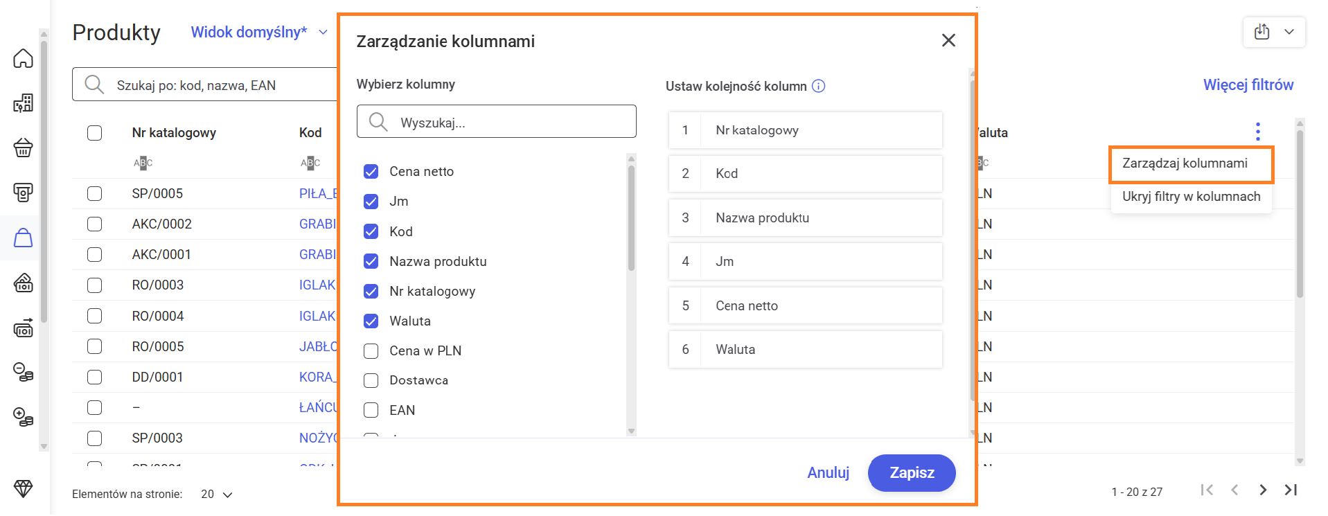 Jak dostosować widok lub kolejność kolumn na liście produktów?