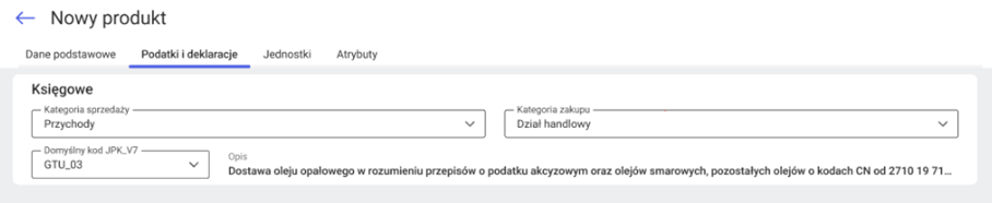 Aby poprawnie przypisać Kategorię sprzedaży i Domyślny kod JPK_V7, należy przejść do zakładki [Podatki i deklaracje] na Formularzu Karty Produktu. Ta zakładka zawiera sekcję Księgowe, która jest dedykowana definiowaniu wspomnianych parametrów.