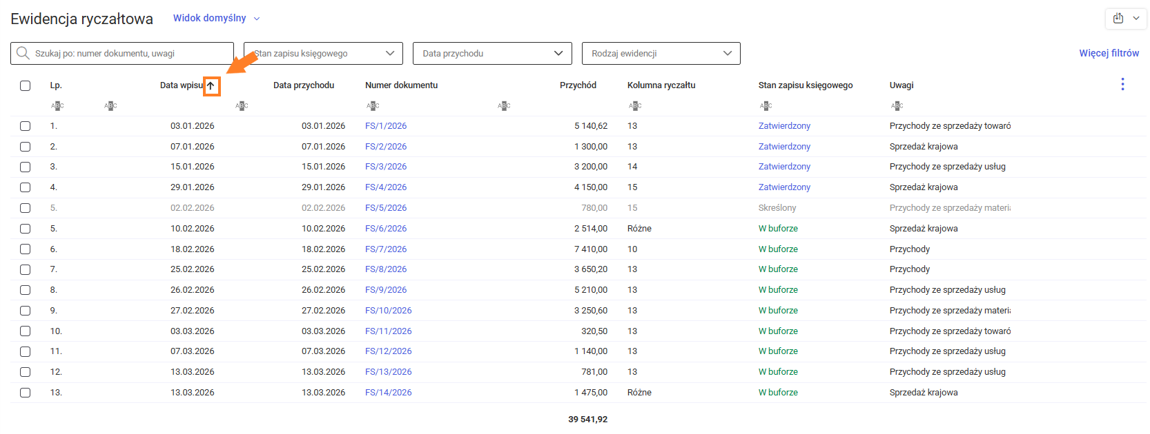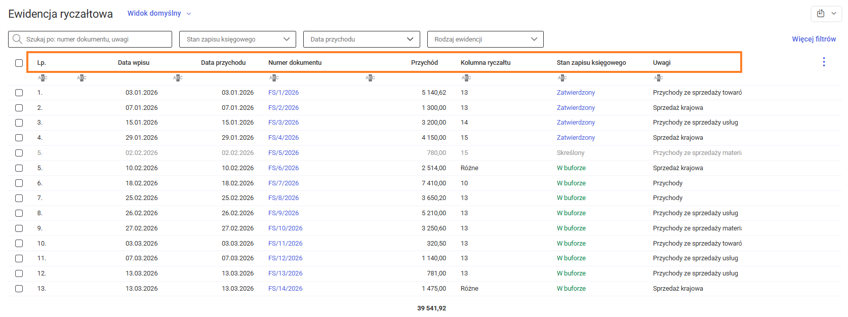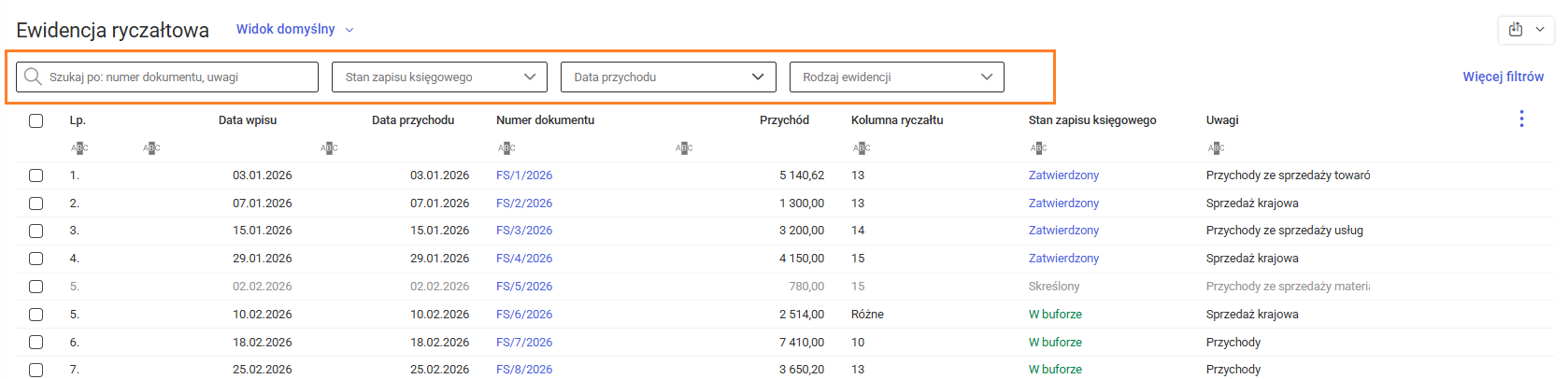 Na górze listy znajduje się pole wyszukiwania, które umożliwia filtrowanie listy zapisów w ewidencji ryczałtowej według numeru dokumentu lub uwag. Obok pola wyszukiwania znajduje się filtr Stan zapisu księgowego, który umożliwia wyświetlanie zapisów o określonym stanie: W buforze, Zaksięgowany lub Skreślony. Dodatkowo listę zapisów można zawęzić, wskazując zakres dat przychodu oraz rodzaj ewidencji. Informacje na temat filtrowania na liście zapisów w ewidencji ryczałtowej znajdują się w artykule Jak filtrować i wyszukiwać zapisy w ewidencji ryczałtowej? Ponadto, istnieje możliwość sortowania listy zapisów w ewidencji ryczałtowej według wybranej kolumny, co pozwala na uporządkowanie listy zgodnie z potrzebami użytkownika.