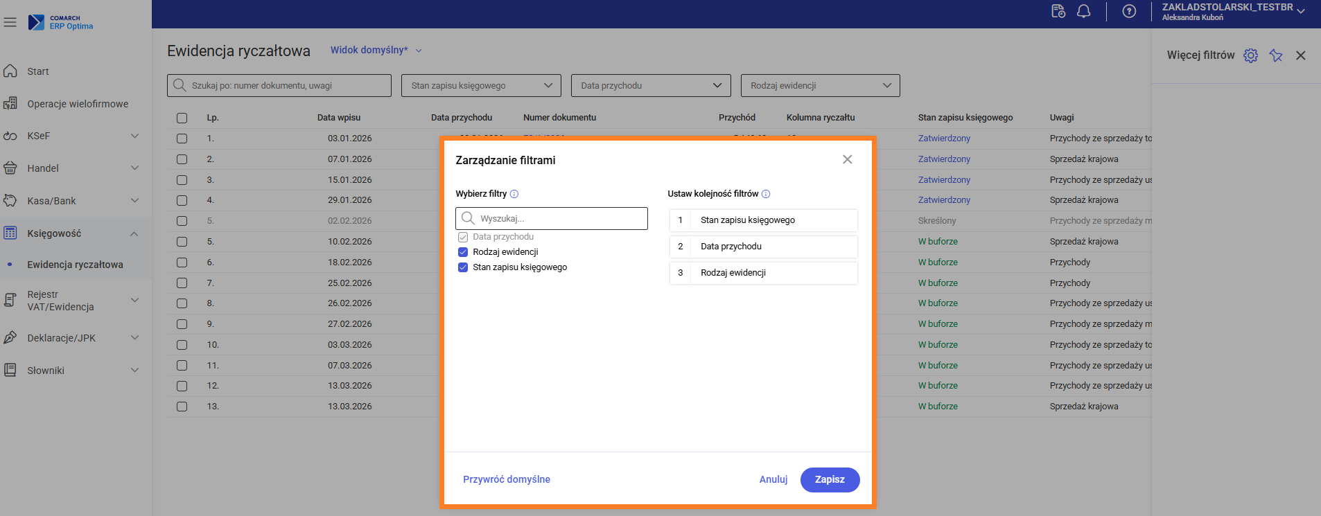 • Stan zapisu księgowego - określa aktualny status zapisu księgowego i może przyjmować wartości: W buforze, Zaksięgowany lub Skreślony