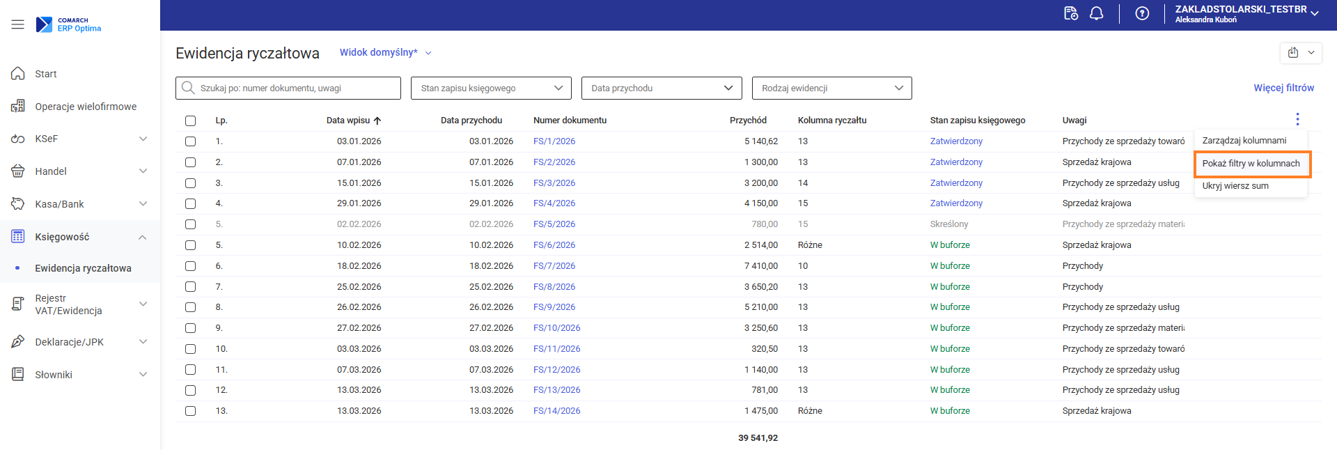 Takie rozwiązanie umożliwia szybkie rozpoznanie, czy oraz ile dodatkowych filtrów zostało aktywowanych, co zwiększa przejrzystość pracy z listą zapisów. Filtry w kolumnach Użytkownik ma możliwość zastosowania filtrów w kolumnach. Funkcja dostępna jest po wybraniu opcji Pokaż/Ukryj filtry w kolumnach, która jest dostępna po naciśnięciu przycisku znajdującego się w prawym górnym rogu listy. Tym sposobem użytkownik również w łatwy sposób może wyfiltrować interesujące go dokumenty.