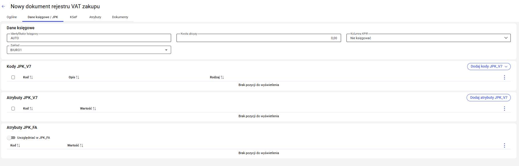 W zakładce Dane księgowe/JPK znajdują się dane dotyczące identyfikatora księgowego, kwoty akcyzy, kodów i atrybutów JPK_V7 oraz atrybutów JPK_FA.