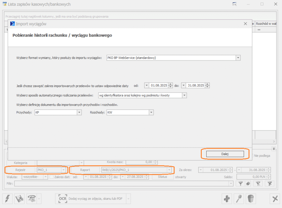 Na liście zapisów wybieramy rejestr bankowy związany z rachunkiem prowadzonym w PKO BP i wskazujemy raport bankowy.