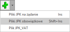 Na oknie Pliki JPK, dostępnym po przejściu do menu JPK/Pliki JPK, po rozwinięciu ikony plusa należy wybrać opcję Pliki JPK obowiązkowe.