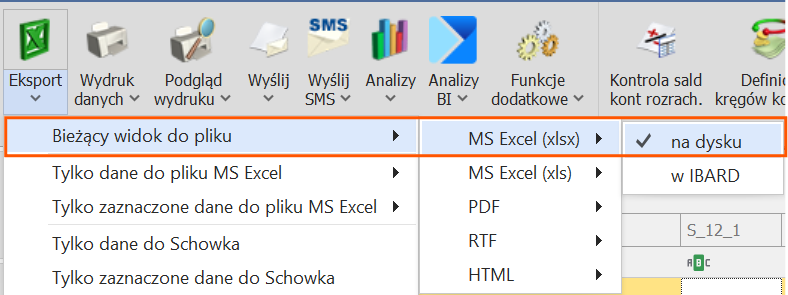 Użytkownik ma możliwość wyeksportowania danych z Comarch ERP Optima za pomocą opcji Eksport/ Bieżący widok do pliku/ MS Excel(xlsx)/ na dysku.