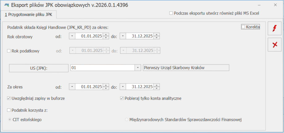 Po wyborze tej opcji otwierane jest okno Eksport plików JPK obowiązkowych: