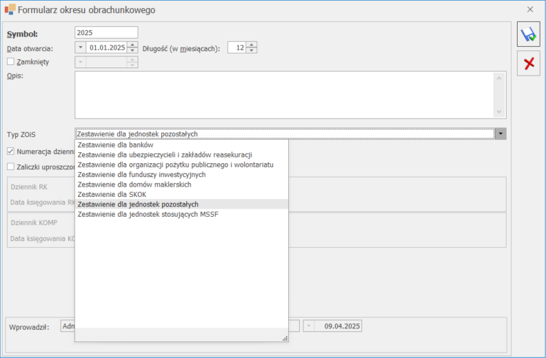 Podczas dodawania kolejnego okresu obrachunkowego domyślnie podpowie się ten sam Typ ZOiS, co w poprzednim okresie obrachunkowym. W kolejnych okresach obrachunkowych możliwe jest wskazanie innych rodzajów działalności.