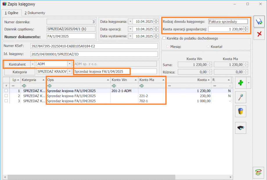- Kontrahent – kod oraz numer NIP kontrahenta wskazanego w nagłówku zapisu,