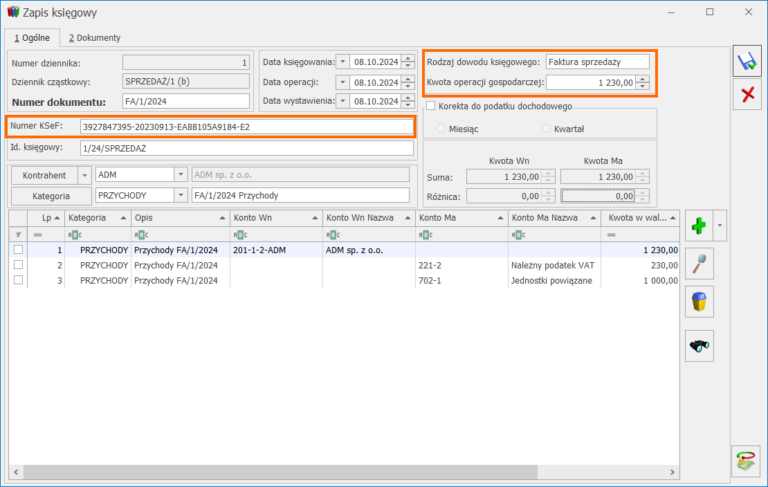 W związku z wymaganiami dotyczącymi pliku JPK_KR_PD, na formularzu zapisu księgowego na zakładce [Ogólne] dodane zostały następujące pola: Numer KSeF, Rodzaj dowodu księgowego, Kwota operacji gospodarczej.