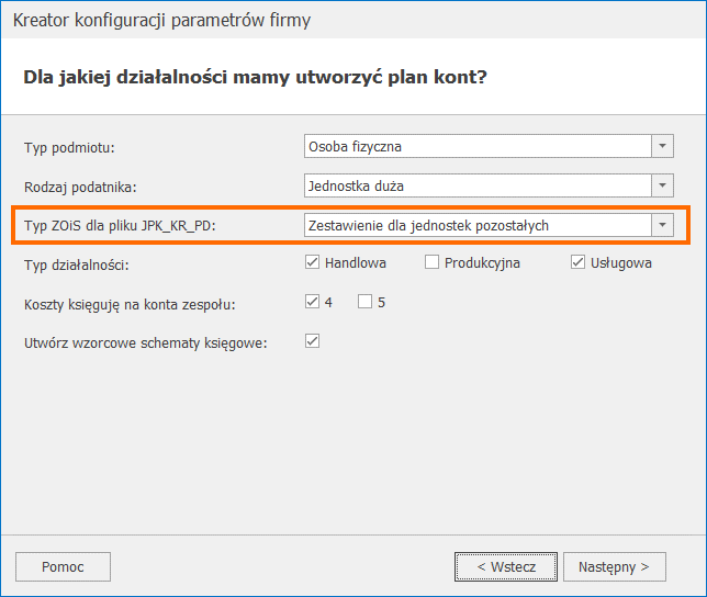 W przypadku dodania nowej bazy danych, w oknie kreatora konfiguracji na etapie kroku Dla jakiej działalności mamy utworzyć plan kont? istnieje możliwość wskazania typu Zestawienia Obrotów i Sald dla pliku JPK_KR_PD