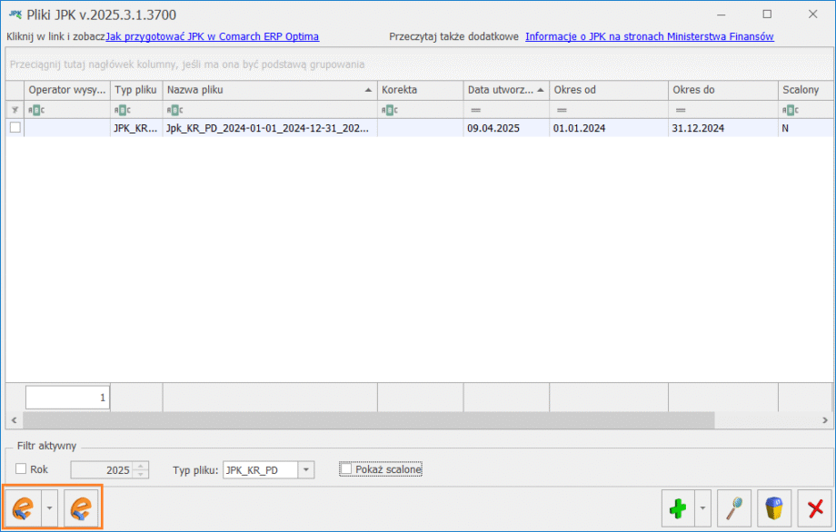 Po kliknięciu ikony Zapisz zmiany następuje wygenerowanie pliku JPK_KR_PD i powrót na okno Pliki JPK.