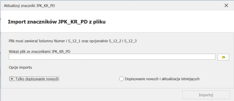 Po wybraniu opcji Aktualizacja znaczników JPK_KR_PD pojawia się okno Importu znaczników JPK_KR_PD z pliku. W tym miejscu użytkownik może wskazać przygotowany plik – arkusz kalkulacyjny .xlsx, zawierający znaczniki JPK_KR_PD.